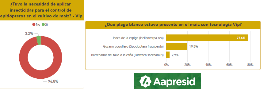 En la campaña pasado un 3,2% del productores agrícolas encuestados por la red de Aapresid indicó que debió aplicar insecticidas antes falla de control de lepidópteras en maíces en tecnología MIR 162, el cual está presente en los eventos Trecepta, VT4 PRO, Power Core Ultra, Viptera 3 y Leptra.