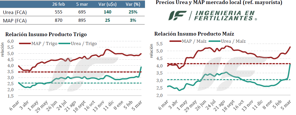 “En la Argentina la reacción de la cadena comercial fue defensiva. Importadores y distribuidores prácticamente se retiraron del mercado ante la dificultad de estimar costos de reposición en un contexto de extrema volatilidad. Recién hacia el final de la semana reaparecieron ofertas muy cautelosas para cubrir necesidades puntuales de corto plazo, con referencias mayoristas de 690-700 u$s/tonelada para urea y de 890-900 u$s/tonelada para MAP/DAP, valores que siguen aún por debajo de los nuevos costos teóricos de reposición CFR”, destaca el documento.
