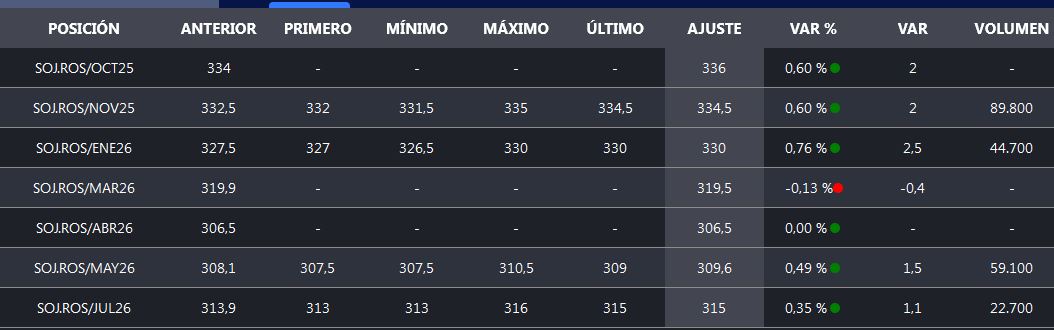 Este jueves la Soja Rosario Mayo 2026 en el mercado A3 terminó en un valor promedio negociado de 309,6 u$s/tonelada con una suba intradiaria del 0,5% y un volumen negociado de 59.100 toneladas.