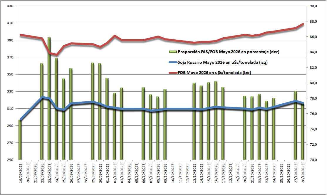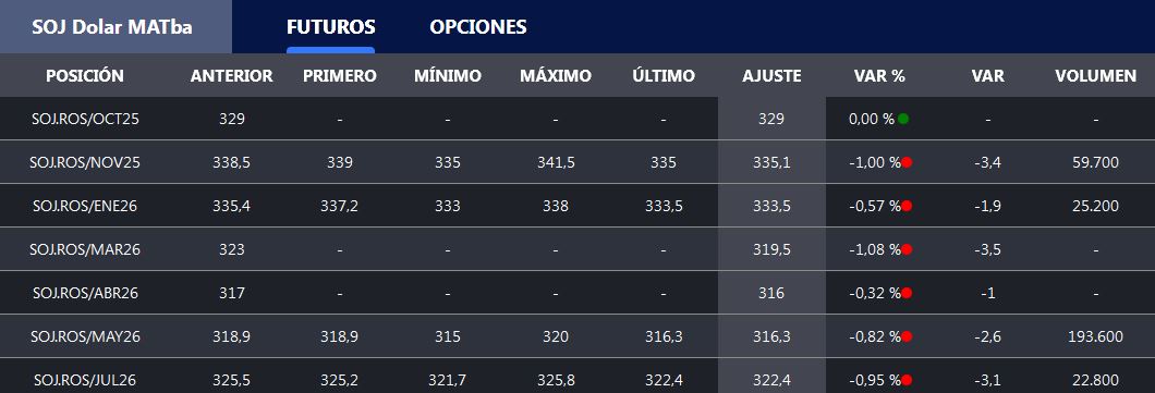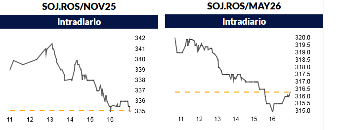 El contrato Soja Rosario Noviembre 2025 se negoció hoy en un promedio de 335,1 u$s/tonelada con una baja intradiaria del 1,0%, al tiempo que la posición Mayo 2026 (nueva cosecha) finalizó en 316,3 u$s/tonelada con una caída del 0,8%.