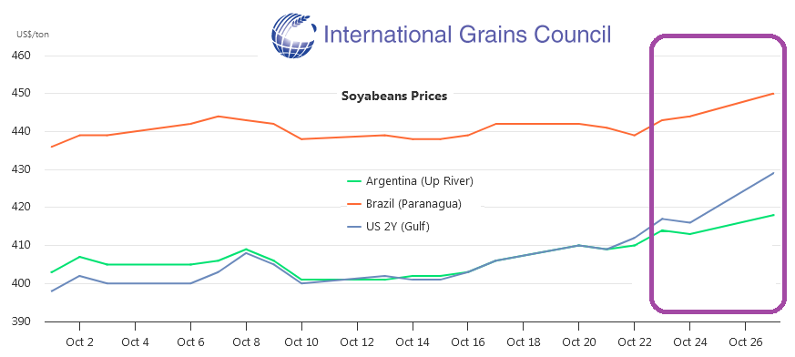 Si finalmente EE.UU. logra volver a exportar soja a China sin restricciones, entonces los precios de la soja entre diferentes orígenes deberían arbitrarse, ya sea por medio de una caída del FOB brasileño, de una suba del FOB de EE.UU/Argentina o bien de ambos procesos en simultáneo.