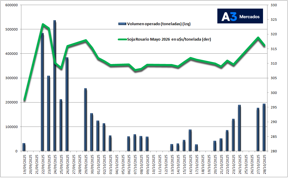 En lo que respecta a la Soja Rosario Mayo 2026 A3, este martes se negociaron 193.600 toneladas en esa posición, el nivel más elevado desde el pasado 29 de septiembre, fecha esta última que corresponde a la tercera jornada posterior a la finalización del régimen de suspensión temporaria de derechos de exportación.
