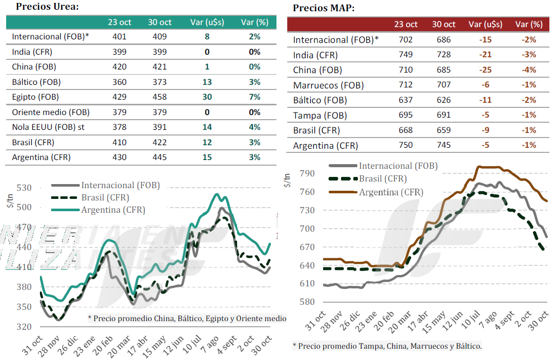En el Báltico la urea se ubicó en un rango de 365-393 u$s/tonelada FOB con productores privilegiando envías a Europa y EE.UU., mientras que en Egipto ventas spot se realizaron en valor de 445-465 u$s/tonelada FOB y en Argelia se alcanzó 470-480 u$s/tonelada FOB.