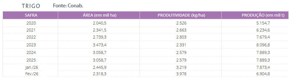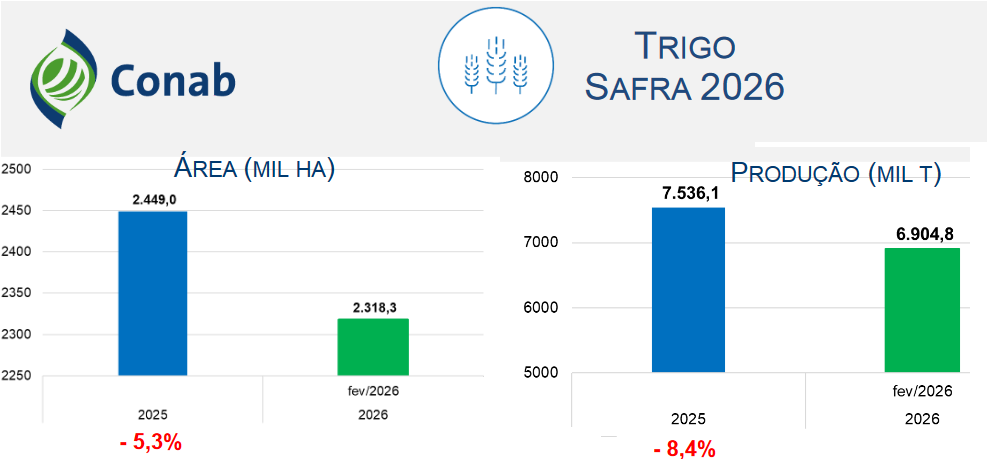El organismo oficial Conab estima que en 2026 Brasil sembraría 2,31 millones de hectáreas de trigo para cosechar 6,90 millones de toneladas, de las cuales 2,01 millones se exportarían como cereal forrajero.