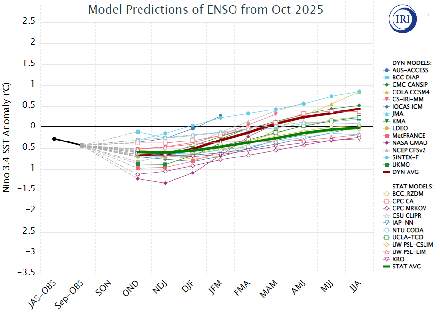 Un mes atrás el pronóstico “objetivo” publicado por CPC/IRI –organismo dependiente de Columbia Climate School– mostraba que había un 60% de probabilidad de que se instale una fase “La Niña” en el último trimestre de 2025.