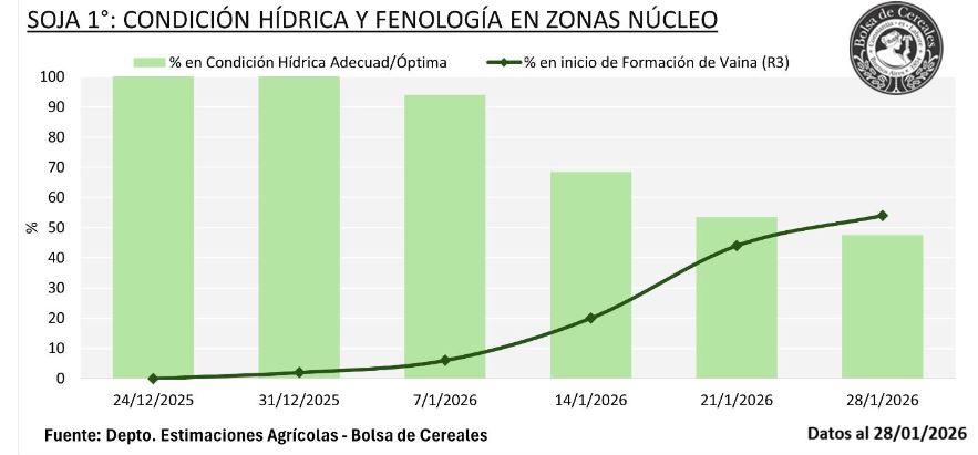 “El 30% de la soja de primera ha iniciado el período crítico (llenado de vaina), principalmente en ambos núcleos de la región pampeana, donde serán necesarias nuevas precipitaciones para sostener el potencial de rendimiento”, advirtió hoy la Bolsa de Cereales de Buenos Aires.