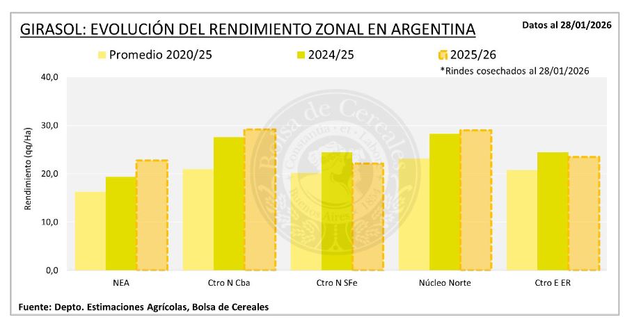 En simultáneo, la cosecha de girasol ya cubre el 24,2% del área apta. Sobre la región NEA el ritmo de recolección se encuentra demorado a la espera de mejores condiciones de suelo para la entrada de las máquinas; en la región, con el 93% del área recolectada, el rendimiento promedio hasta el momento es de 22,7 qq/ha.