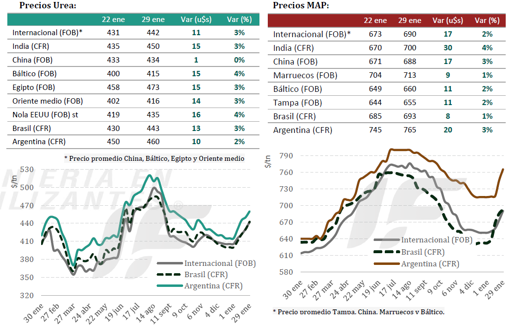 “A esto se suma la continuidad de las restricciones de exportación desde China, que permanecería mayormente ausente del mercado internacional hasta el segundo semestre. En este contexto, los compradores priorizan cobertura anticipada, especialmente en fosfato monoamónico (MAP), producto que muestra mayor atractivo relativo frente a otras fuentes fosfatadas”, añade.