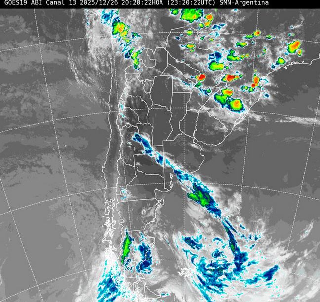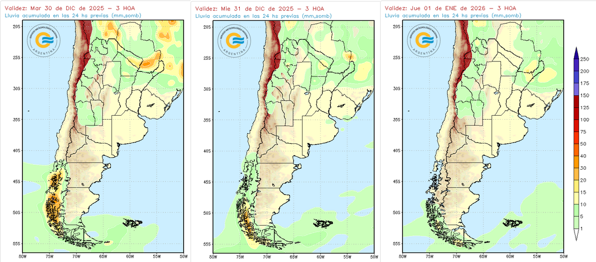 “El jueves –el primer día de 2026– habrá un ligero descenso de temperaturas, producto del pasaje de un frente frío, que activará lluvias y tormentas dispersas en algún momento del día en la región cuyana, las provincias de Córdoba, norte de Santa Fe y de Entre Ríos, Santiago del Estero, el NOA y el NEA”, señala Saldívar.