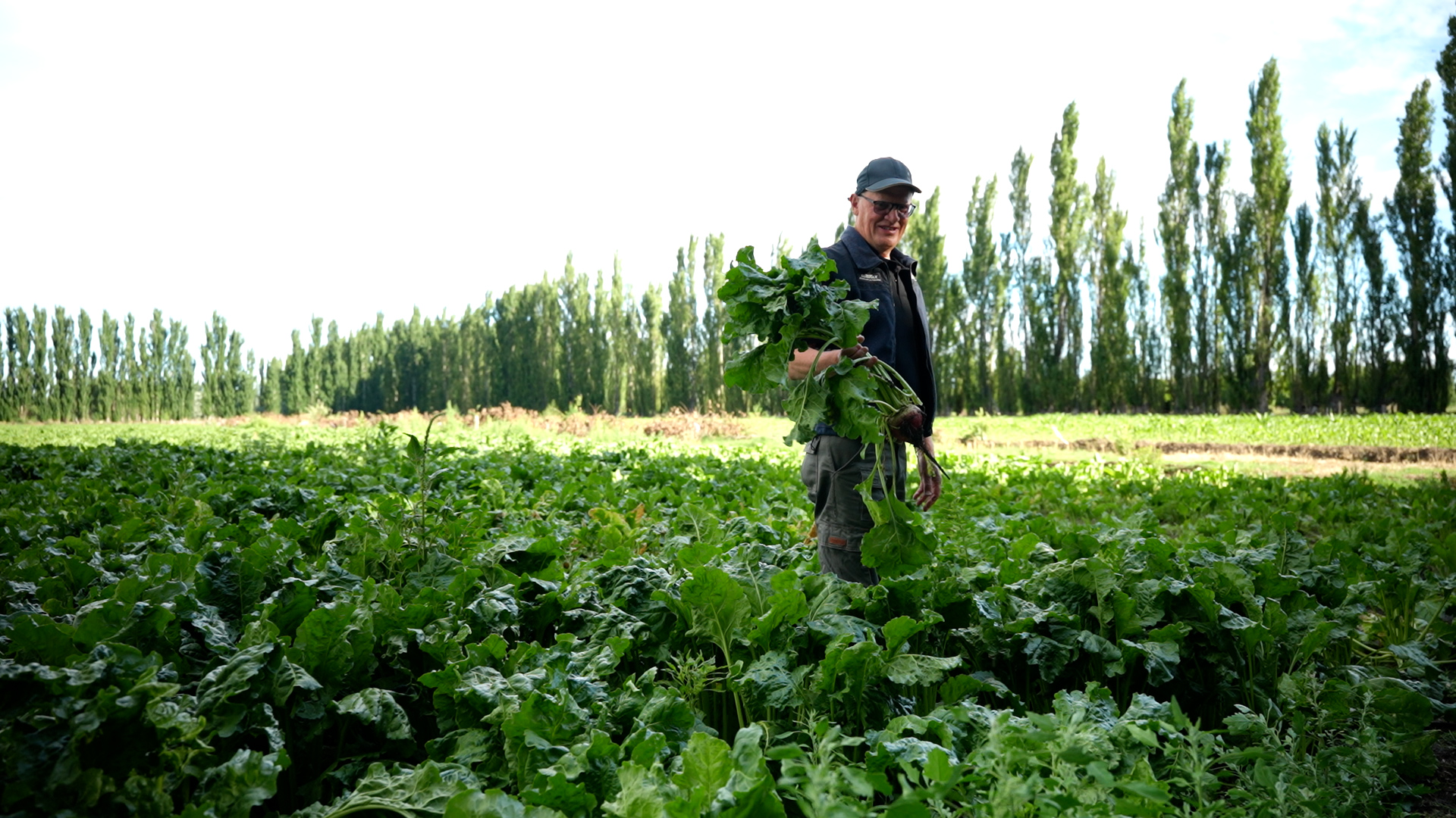 Como él, su chacra familiar también probó muy diferentes cosas. De hecho, todo el Valle Medio de Río Negro que la alberga ha sido un campo permanente de ensayos en las últimas décadas. Hubo fruta primero, vitivinicultura, luego se hizo tomatera, más tarde albergó la tradicional alfalfa y otras pasturas, desde hace siete años que Raúl incorporó allí las vacas, y ahora -para eso vinimos- está alojando nada menos que la nueva joyita productiva de esta región, la ya famosa remolacha forrajera.