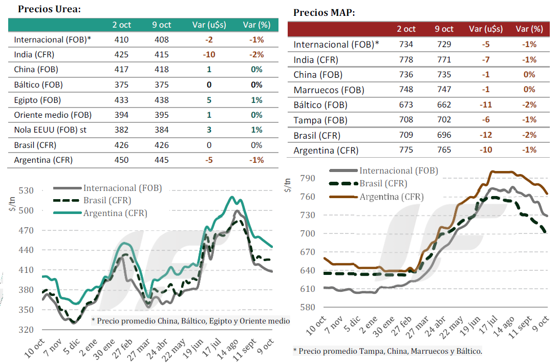 La Argentina sigue con poca actividad comercial y precios estables de importación de la urea en torno a 445  u$s/tonelada CFR, mientras que en fosfato monoamónico (MAP) el promedio se ubica en 765 u$s/tonelada CFR con demanda débil y varios compradores retirados a la espera de mayores bajas.