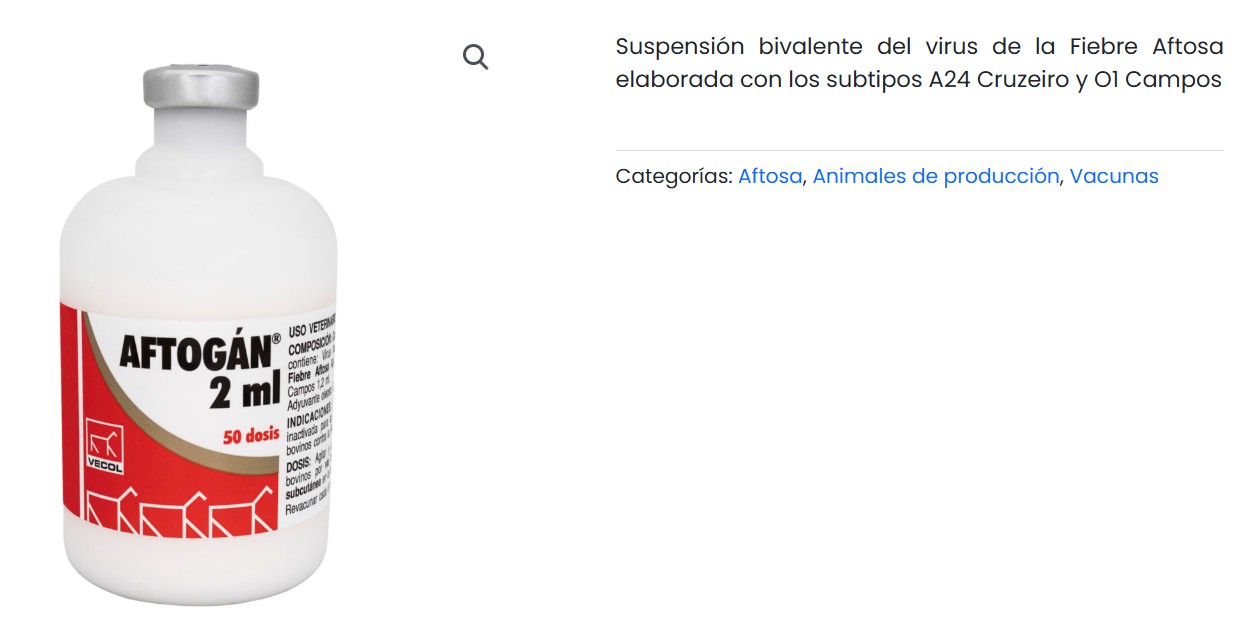 Se trata de una “suspensión bivalente del virus de la Fiebre Aftosa elaborada con los subtipos A24 Cruzeiro y O1 Campos”, es decir que contiene las dos cepas exigidas ahora por Senasa.