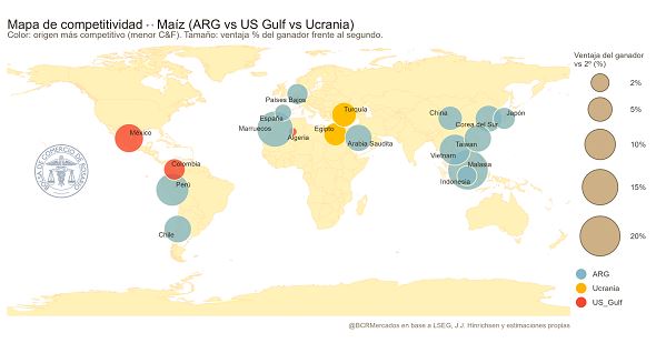 “En África, países tales como Egipto, Marruecos y Argelia son importantes destinos para Argentina. La cotización C&F, que contempla el precio en origen más el costo de flete marítimo, está muy cercano a la estadounidense o ucraniana e inclusive llega a posicionarse como la mejor opción para los compradores marroquíes. En Asia el maíz argentino es el más atractivo”, destaca el informe.