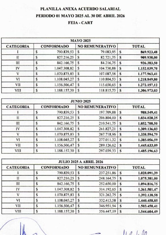 Lazarte explica: “Tener un básico tan bajo nos juega en contra por el tema de lo que son las horas extras, lo que es antigüedad, lo que es hora por altura, lo que tiene las polifunciones, es decir todos los ‘plus’ que uno tiene que se calcula sobre el básico y no sobre la tira final, es por eso por lo que nosotros siempre estamos perdiendo comparándonos con sueldo de Tucumán”.