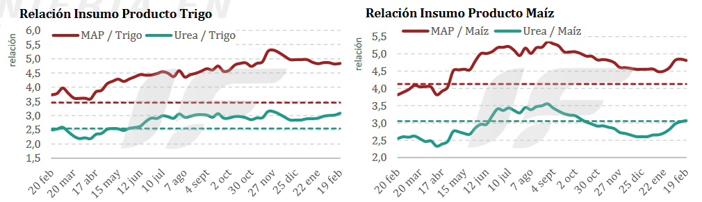 “El precio local de la urea granulada aparece significativamente atrasado frente al costo teórico de reposición. Sin embargo, esa señal técnica no activa demanda inmediata. El productor observa la relación urea/trigo y percibe mayor probabilidad de mejora relativa vía baja del insumo, suba del grano o ajustes macroeconómicos”, señala el informe.
