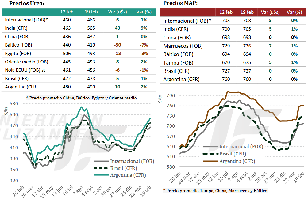 “La oferta de fosfatados continúa ajustada por la prolongada ausencia exportadora de China y por restricciones logísticas en Marruecos y en la zona del Báltico, mientras los costos del azufre siguen elevados, aunque con señales incipientes de estabilización. La demanda se mantiene activa en mercados puntuales, pero con India aún expectante ante definiciones de subsidios”, resume el informe.
