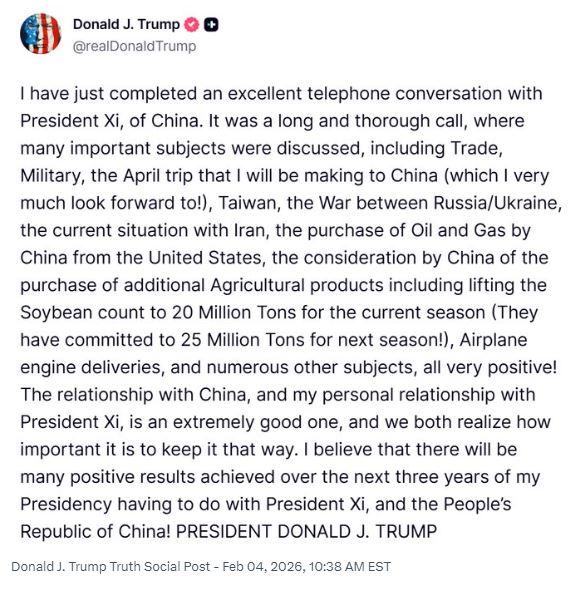 “Acabo de completar una excelente conversación telefónica con el presidente Xi (Jinping) de China. Fue una llamada extensa y completa, en la que se discutieron muchos temas importantes, incluidos comercio, militares, el viaje que haré a China en abril (¡que espero con muchas ganas!), Taiwán, la guerra entre Rusia y Ucrania, la situación actual con Irán, la compra de petróleo y gas por parte de China a EE.UU., la consideración por parte de China de la compra de productos agrícolas adicionales, incluido el aumento de soja a 20 millones de toneladas para la temporada actual (¡se han comprometido a 25 millones de toneladas para la próxima temporada!), entregas de motores de avión y muchos otros temas, ¡todos muy positivos!”, indicó Trump en redes sociales.