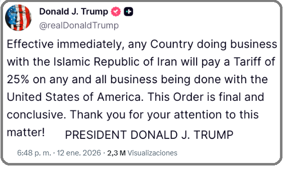 “Con vigencia inmediata: cualquier país que realice negocios con la República Islámica de Irán pagará un arancel del 25% sobre todos los negocios que realice con EE.UU. Esta Orden es definitiva y concluyente”, indicó anoche el presidente Donald Trump en redes sociales.