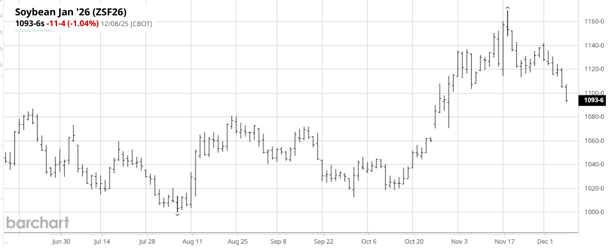 Este lunes el contrato de Soja Enero 2026 CME terminó en un promedio de 401,8 u$s/tonelada con una baja intradiaria de 4,2 u$s/tonelada, mientras que la posición Mayo 2206 finalizó en 410,3 u$s/tonelada con una caída de 3,2 u$s/tonelada.