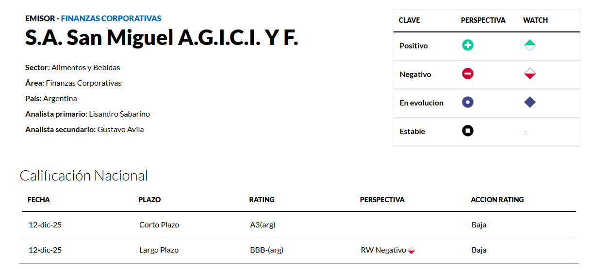 Eso explica cuál es el sustento detrás de la decisión de no pagar al mercado en este momento. La empresa prefiere ponderar el alivio momentáneo a su caja a costa de perder calificación crediticia, porque seguramente no esté en sus planes financiarse por esos medios al menos en el corto plazo. Recientemente, la entidad FIX SCR bajó la calificación de emisor de largo plazo de San Miguel y de sus obligaciones negociables.