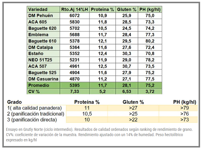 En el sitio de Grutly Norte, también con ciclos intermedios, los rindes se ubicaron entre los 48 a los 60 qq/ha y se destacó DM Pehuén con 60 qq/ha de rendimiento, seguido por ACA 605, Baguette 620 y Klein Emblema.