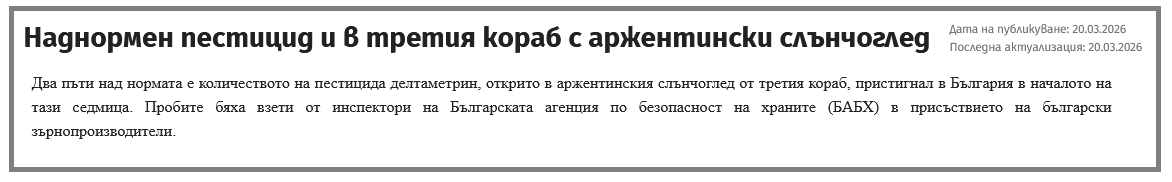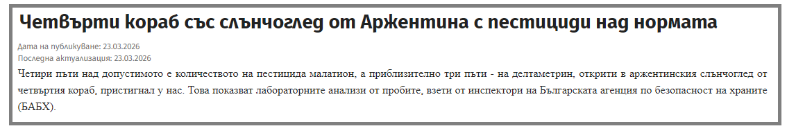 “La cantidad del insecticida deltametrina encontrada en el girasol argentino del tercer cargamento que llegó a Bulgaria a principios de esta semana duplica el nivel permitido”, añadió.