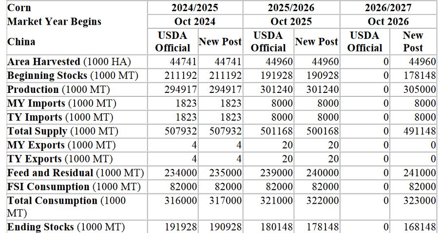 El informe prevé que el maíz siga siendo el producto básico central en el complejo de granos forrajeros de China, con una producción en la campaña 2026/27 que aumentará a 305 millones de toneladas gracias a la mejora de los rendimientos, mientras que el consumo total alcanzaría 323 millones y las existencias finales disminuirán a 168 millones.