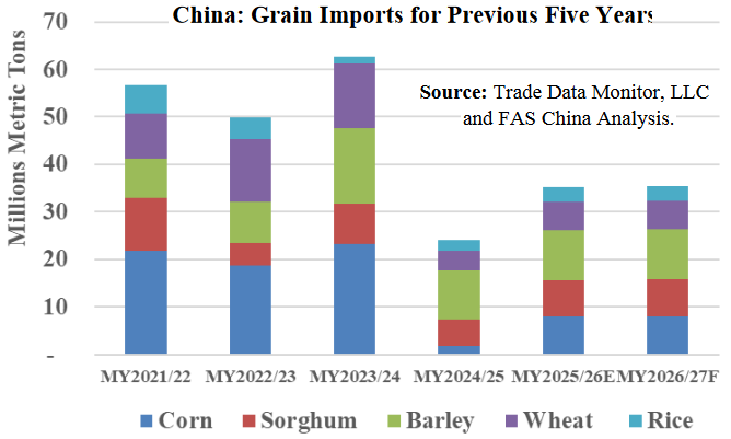 La oficina del USDA en Pekín prevé que las importaciones de maíz alcancen en 2026/27 los 8,0 millones de toneladas, sin cambios respecto a la campaña 2025/26, ya que China continúa desalentando las importaciones del cereal.