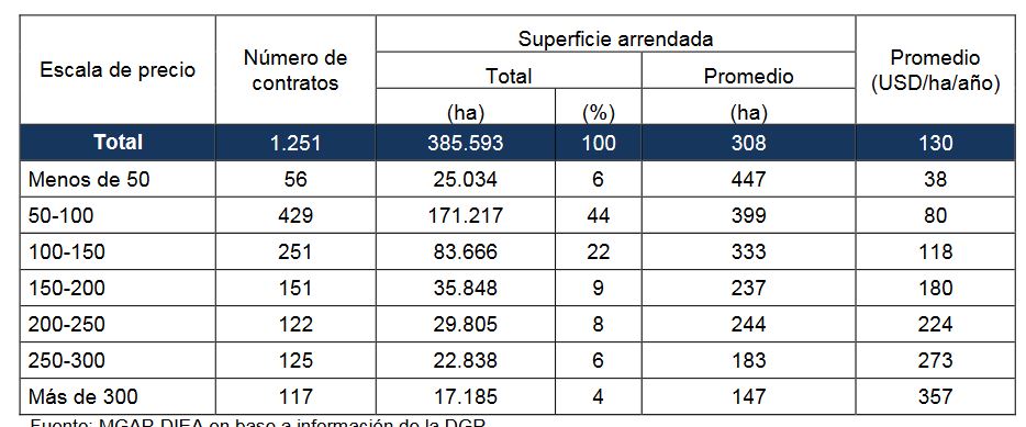 Soriano, Colonia y San José, departamentos con rentas exclusivamente para agricultura de secano, registran los precios medios de renta más altos: 247, 246 y 238 u$s/ha/año respectivamente. En el otro extremo, los contratos que se acordaron a menores valores corresponden al departamento de Artigas promediando 75 u$s/ha/año, seguido por el departamento de Salta que alcanzó los 89 u$s/ha/año.