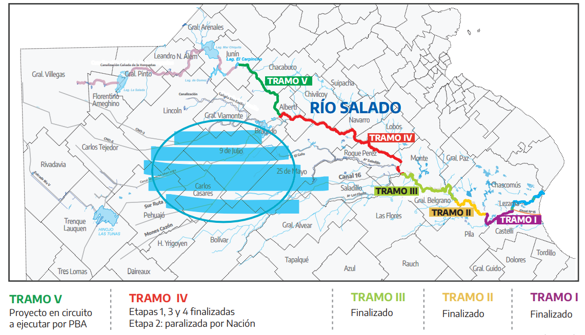 Hay un problema adicional, que es contar con obras necesarias para transportar la gran masa de agua que baja desde el oeste bonaerense (y que actualmente se acumula sobre los partidos de Carlos Casares, Pehuajó, 9 de Julio y Bragado), hasta el río Salado, de manera de que éste (una vez que estén concluidas todas las obras pendientes) pueda evacuar todos esos excedentes.
