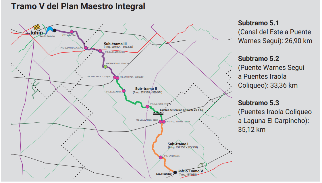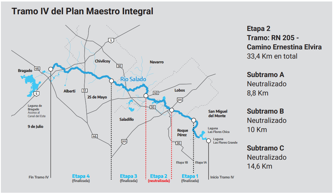 “Se trata del segmento final con el que se completará el Plan Maestro y que se extiende sobre 98 kilómetros en total, entre el Canal del Este de la laguna de Bragado y la descarga de la laguna El Carpincho, en Junín, atravesando también los municipios de Chacabuco y Alberti. Asimismo, contempla la
