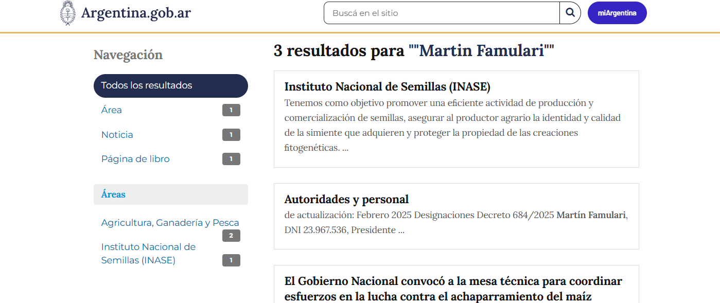 Pese a ello, Famulari es una cara prácticamente desconocida. Ingeniero agrónomo egresado de la UBA, ocupó primero un cargo secundario en la Secretaría de Agricultura, el de director de Innovación, Buenas Prácticas y Tecnología Agrícola, y hace pocos meses fue impulsado para el INASE luego de la renuncia allí por Claudio Dunan, un ex ejecutivo de Bioceres que decidió dejar el gobierno libertario por la degradación que pretendía imponer el ministro Sturzenegger en ese instituto descentralizado (al igual que en el INTA) y que fue evitada por el Congreso Nacional.