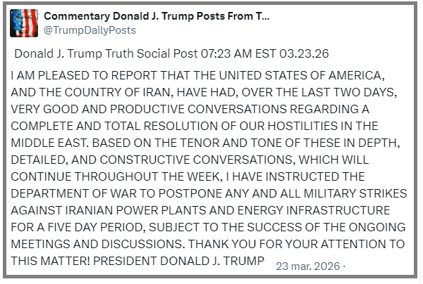 “En vista del tono de estas conversaciones profundas, detalladas y constructivas, que continuarán a lo largo de la semana, he instruido al Departamento de Guerra de EE.UU. para que posponga todos los ataques militares contra centrales eléctricas e infraestructura energética iraníes durante un período de cinco días, medida sujeta al éxito de las reuniones y conversaciones en curso”, añadió.