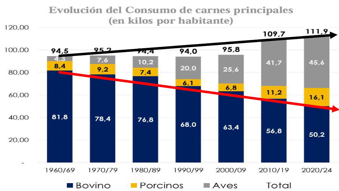 “Sin crecimiento de las exportaciones, no hay futuro para la ganadería argentina”, aseguró Tonelli. El mercado externo no sólo permite valorizar e integrar mejor la res bovina, sino que resulta clave para adaptar la oferta interna a la dinámica de la matriz de consumo de proteínas animales, la cual –tal como ha sucedido en muchas otras naciones– viene registrando un crecimiento sistemático de los sectores aviar y porcino.