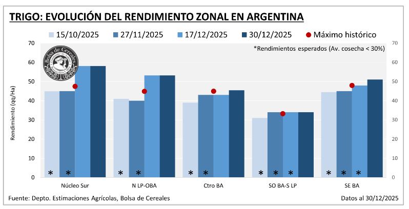La cosecha a nivel nacional ya alcanzó casi el 93% del área para generar una oferta de cereal de 25,7 millones de toneladas. “La generalización de las labores sobre el sur del área agrícola, y fundamentalmente el centro y sudeste bonaerense, continuó arrojando rendimientos iguales o algo superiores a máximos históricos”, señaló la Bolsa de Cereales de Buenos Aires.