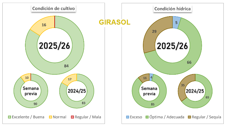 “En cuanto al área en pie, la falta de lluvias sobre el sur agrícola podría comprometer a la oleaginosa que transita entre botón floral y floración con condición hídrica adecuada a óptima en el 57,6% de los casos. A la espera de nuevas precipitaciones que acompañen esos estadios en esta franja, sostenemos la actual proyección de producción en 5,8 millones de toneladas”, añade.