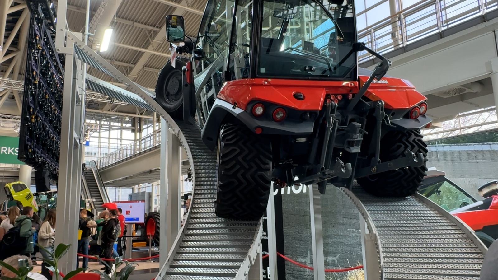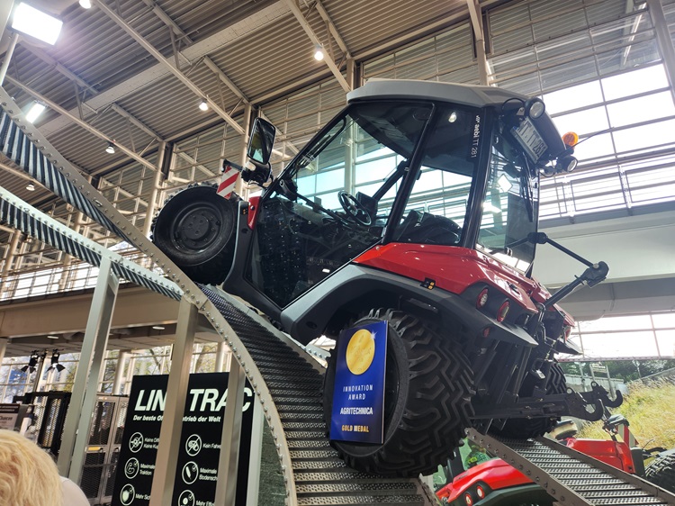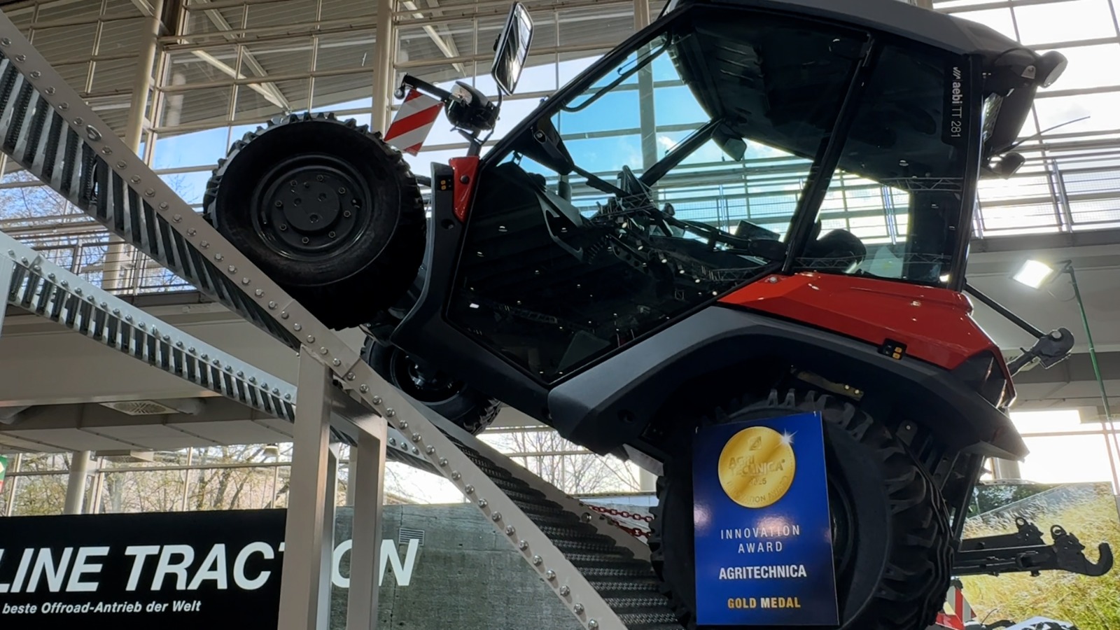 Sin embargo, cada tanto aparece un desarrollo menos vistoso, de algún fabricante con stand más chico, que termina siendo más disruptivo que cualquier tanque de acero. Este año, una de las medallas de oro se la llevó un tractor trepador que desarrolló la empresa Müller Landsmaschinen en conjunto con la fabricante de tractores Aebi Schmidt. El prototipo que llevaron, es capaz de trepar y doblar al mismo tiempo, ya que posee tracción independiente en cada una de sus cuatro ruedas.