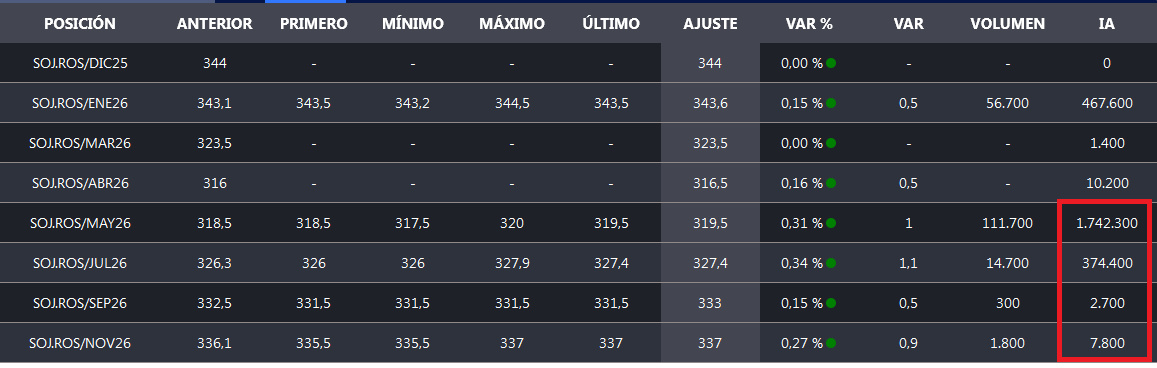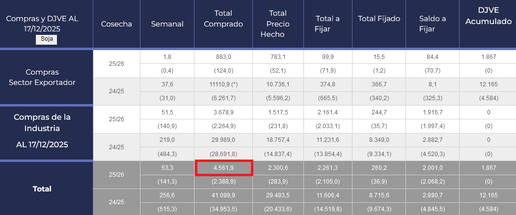Al pasado 17 de diciembre, según el último registro oficial disponible, la demanda (exportación + industria) había adquirido 4,56 millones de toneladas de soja 2025/26, del cual sólo 2,56 millones tenía precio hecho (el resto corresponde a operaciones “a fijar”). Por otra parte, en el mercado A3 las posiciones abiertas de los contratos futuros de soja 2025/26 suman 2,12 millones de toneladas.