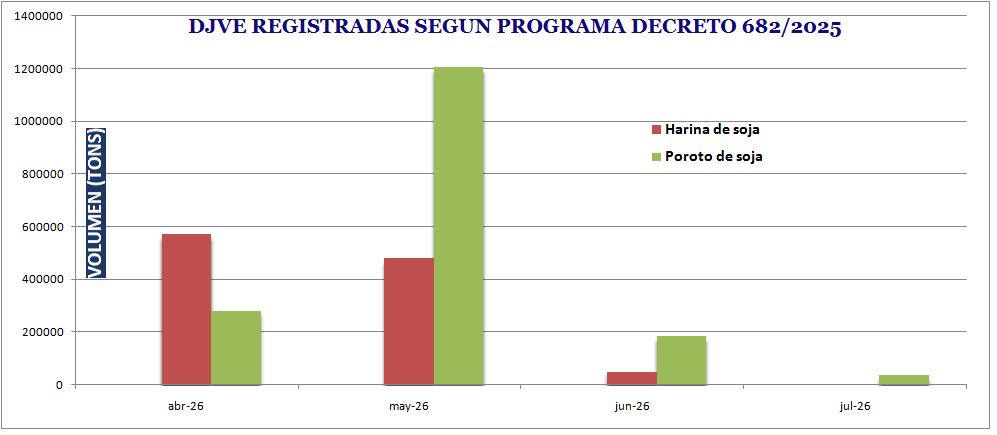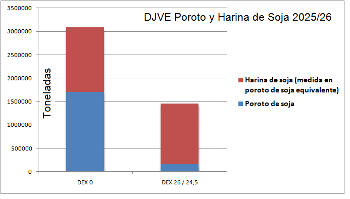 Una vez finalizado el régimen el 26 de septiembre, se registraron nuevas DJVE con una retención del 26,0% en poroto y del 24,5% en harina de soja hasta completar un total de embarques 2025/26 por 1,87 millones de toneladas de poroto y 2,14 millones de toneladas de harina.
