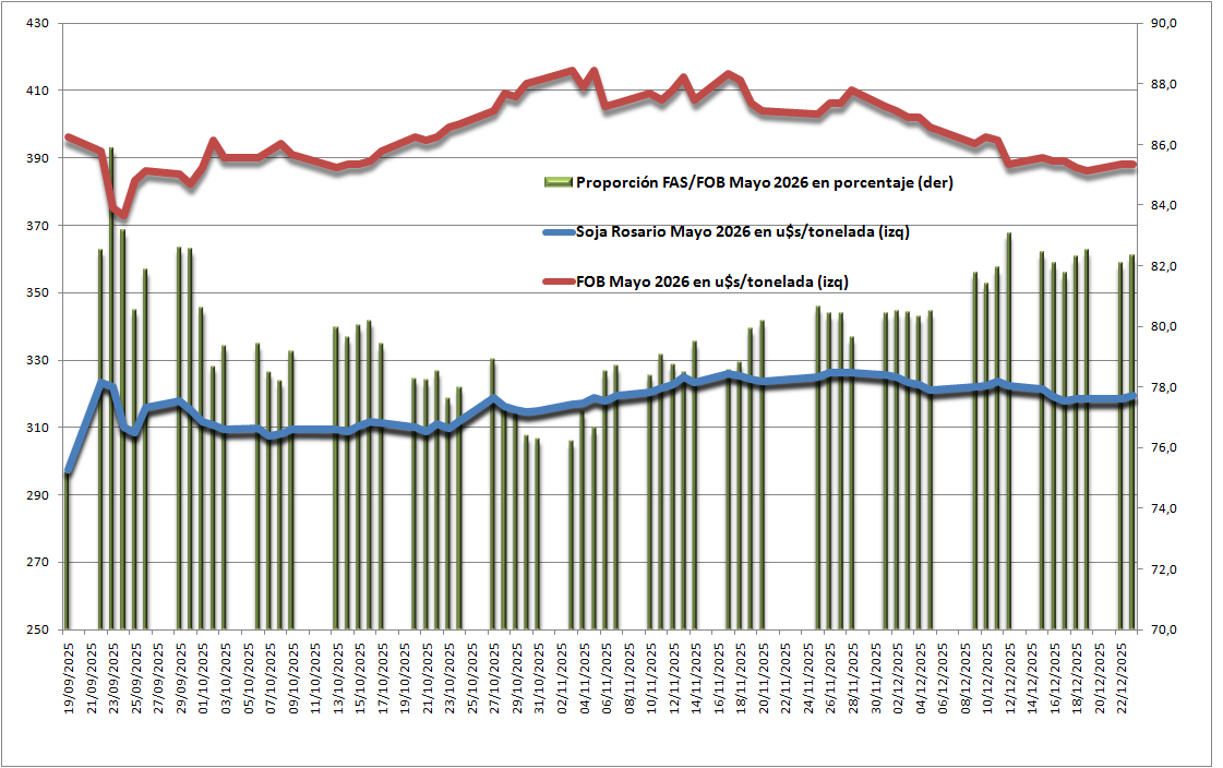 Pero cuando los precios FOB de la soja comenzaron a caer en el último mes, esos intentos fueron revertidos ante la necesidad de originar mercadería para la nueva campaña y así la proporción del valor FAS sobre el FOB volvió a recuperarse.