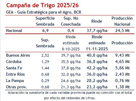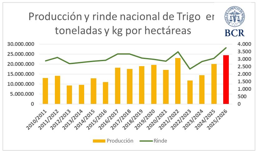 El rendimiento promedio nacional estimado también es récord con 37,7 qq/ha, lo que se explica fundamentalmente por condiciones climáticas excepcional para el trigo en el transcurso del presente año.