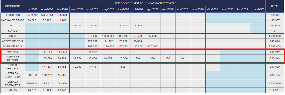 Las Declaraciones Juradas de Ventas Externas (DJVE) de semilla de girasol para la presente campaña 2025/26 alcanzan 528.986 toneladas, mientras que las de aceite de girasol son hasta el momento de 223.943 toneladas.